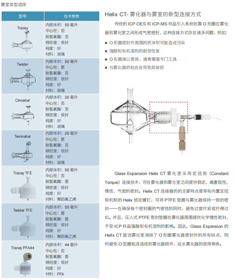 霧室是 ICP 進(jìn)樣系統(tǒng)的另一個關(guān)鍵組成部分,直接影響了進(jìn)樣系統(tǒng)的霧化效率、精度和洗出時間。GE 的 Tracey 和Twister 旋流霧化室改進(jìn)了 ICP 霧化室的傳統(tǒng)設(shè)計,提高了霧化效率,降低了洗出時間。Glass Expansion 獨(dú)特的Helix CT 霧化器連接方式,零死體積,可提高樣品通量。
