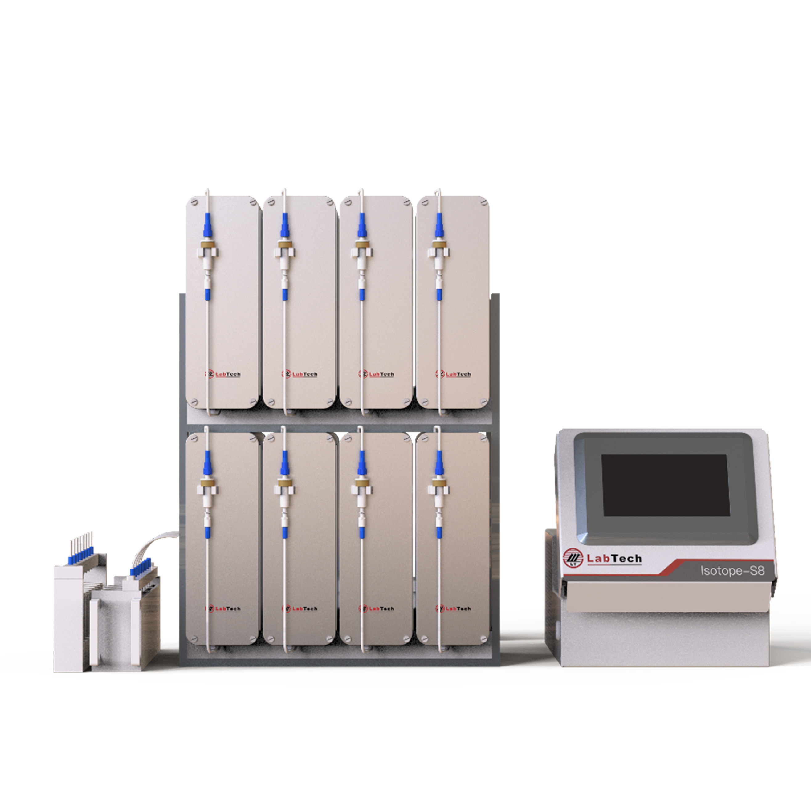 Isotope-S8主體部件置于封閉手套箱內(nèi)部,輔助設(shè)備及控制系統(tǒng)位于手套箱外部。裝置主體部分采用316L不銹鋼材質(zhì),管路材料為PTFE/PFA等耐腐蝕材料, 電磁閥耐酸腐蝕。Isotope-S8分為單柱型和串柱型,一模塊一通道,1-8通道可以任意組合,程序內(nèi)置, 一鍵式運(yùn)行,按照預(yù)定程序自動(dòng)完成柱平衡、上柱、淋洗、洗脫、收集與再生。控制軟件可以實(shí)現(xiàn)對(duì)裝置運(yùn)行狀態(tài)實(shí)時(shí)監(jiān)測(cè),運(yùn)行數(shù)據(jù)的實(shí)時(shí)記錄、統(tǒng)計(jì)與展示,包括廢液體積、試劑存量等。