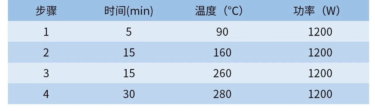 準(zhǔn)確稱取0.1g左右樣品(精確至0.0001g)放入干燥潔凈的石英管中,至于支架上;每根管子分別添加4mL硝酸及適量氧化劑;蓋上樣品管蓋后,將支架放入已添加載液(150mL純水,5mL硫酸)的內(nèi)襯筒中,預(yù)加壓;按照表1中升溫程序進(jìn)行消解。程序運(yùn)行完畢后,冷卻取出,打開(kāi)罐蓋,取出樣品,擦干儀器。