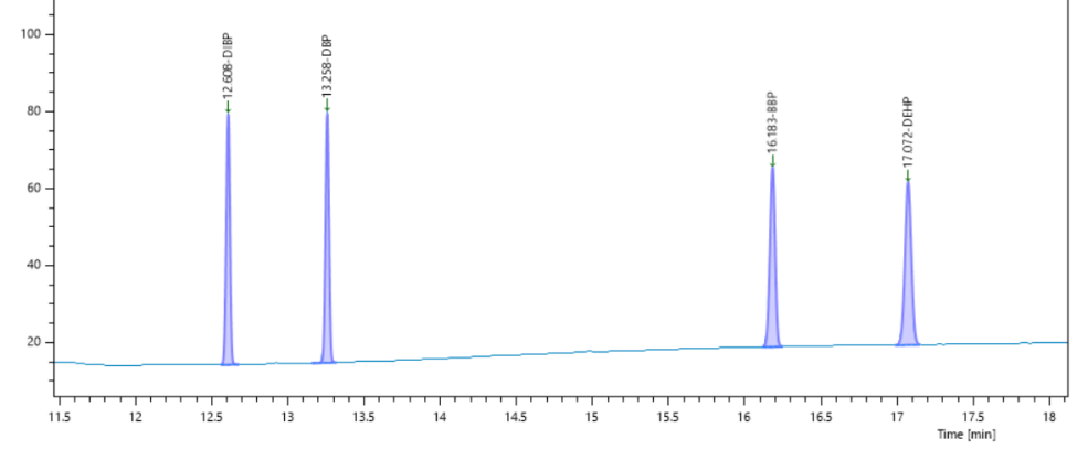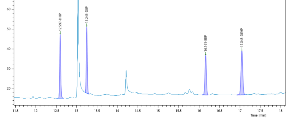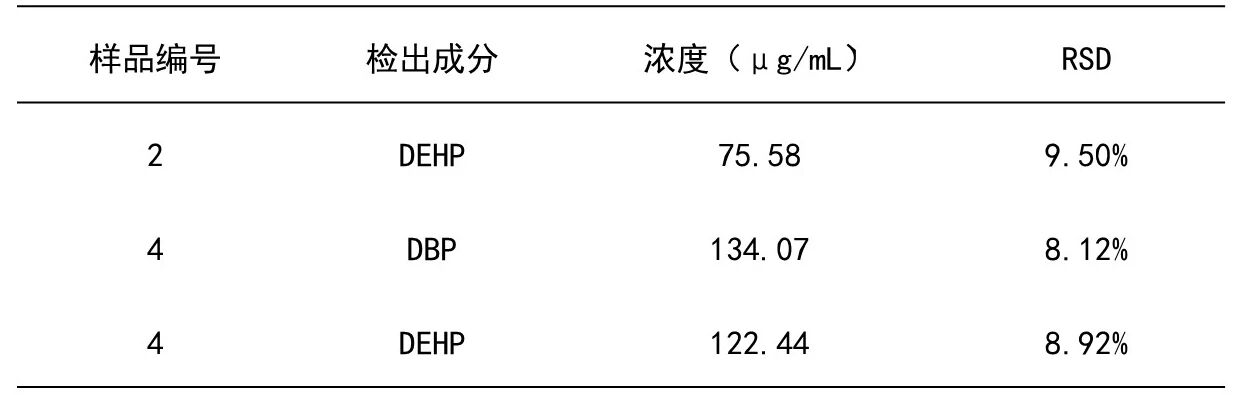 以上測試結果中,四種鄰苯二甲酸酯的6針重復性<1.3%,加標回收率在88%-99%之間,保留時間RSD<0.01%,滿足相關標準中鄰苯二甲酸酯檢測的要求。對實際樣品進行測試驗證,7種樣品中2、4號雖有檢出,檢出成分分別為DEHP、DBP,但均低于標準最低限量,為合格樣品。實際固體樣品的檢出重復性<10%。