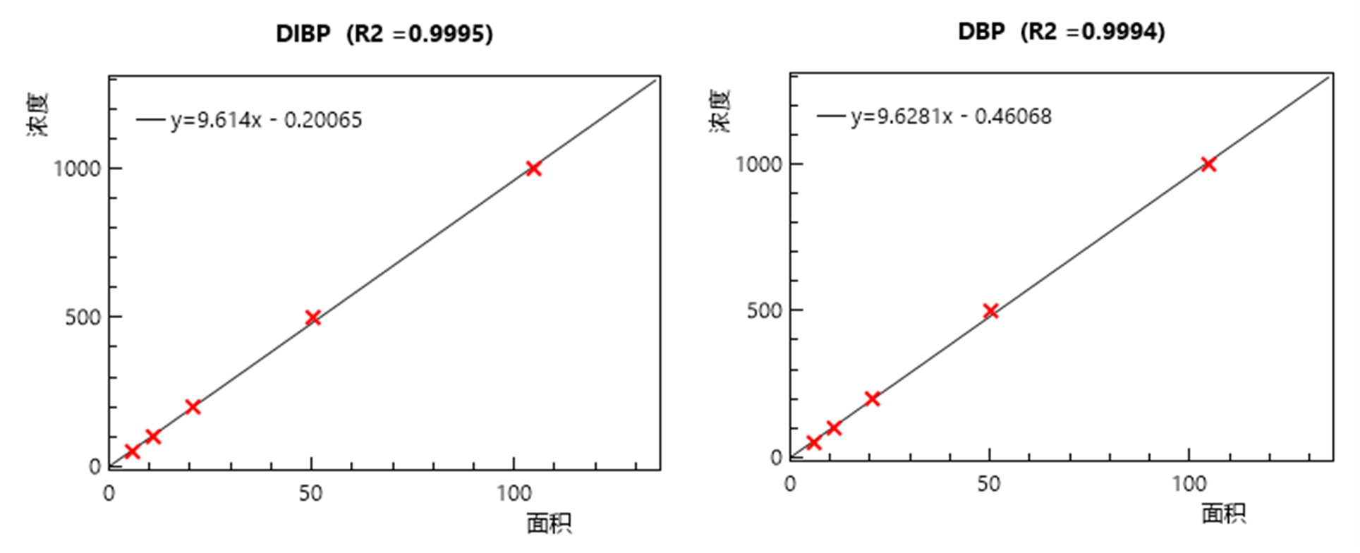 將標準使用液分別配制為50、100、200、500、1000μg/mL的標準溶液,從低濃度到高濃度依次上機分析,記錄目標化合物的保留時間和響應值。
