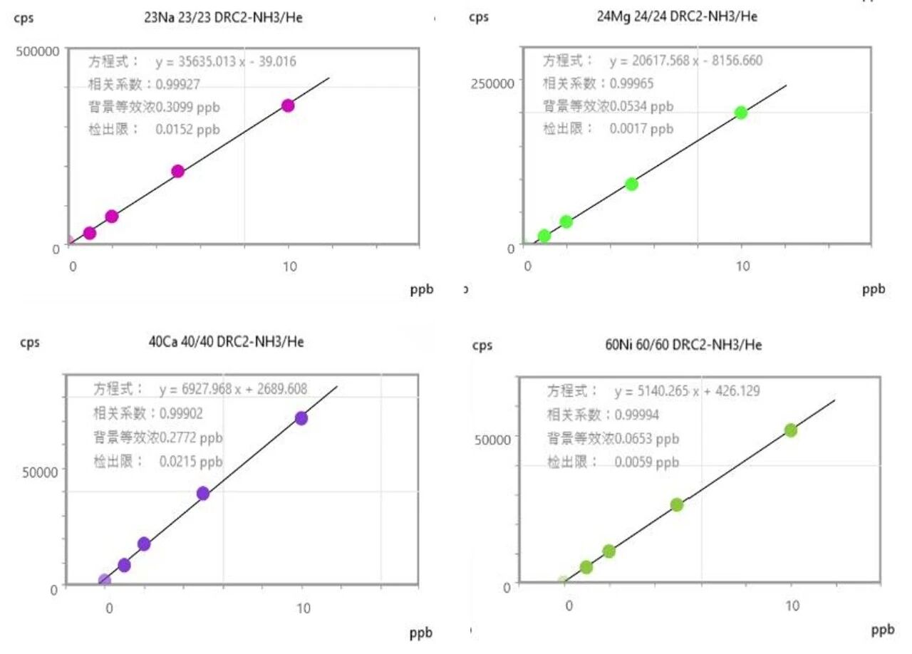 因此針對Mg、Ca、Ni 等易干擾的元素,LabMS 5000 ICP-MS/MS采用DRC-NH?模式(on mass),可通過電荷轉(zhuǎn)移或質(zhì)量轉(zhuǎn)移反應(yīng)消除干擾,同時 Ca?、Mg? 等與 NH? 反應(yīng)活性低,得以保留,大幅降低了背景信號干擾,實現(xiàn)了目標(biāo)離子的精準(zhǔn)檢測。