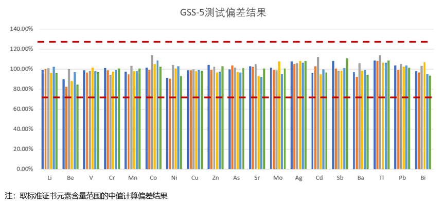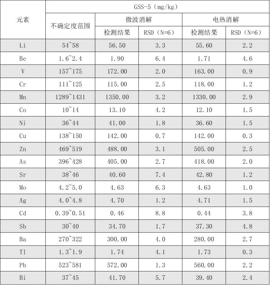 使用REVO微波消解儀和DigiBlock消解儀消解GSS-5標(biāo)準(zhǔn)物質(zhì),LabMS 3000 ICP-MS檢測(cè)消解溶液中的19種元素,檢測(cè)結(jié)果均滿足標(biāo)準(zhǔn)樣品證書不確定度范圍的要求。