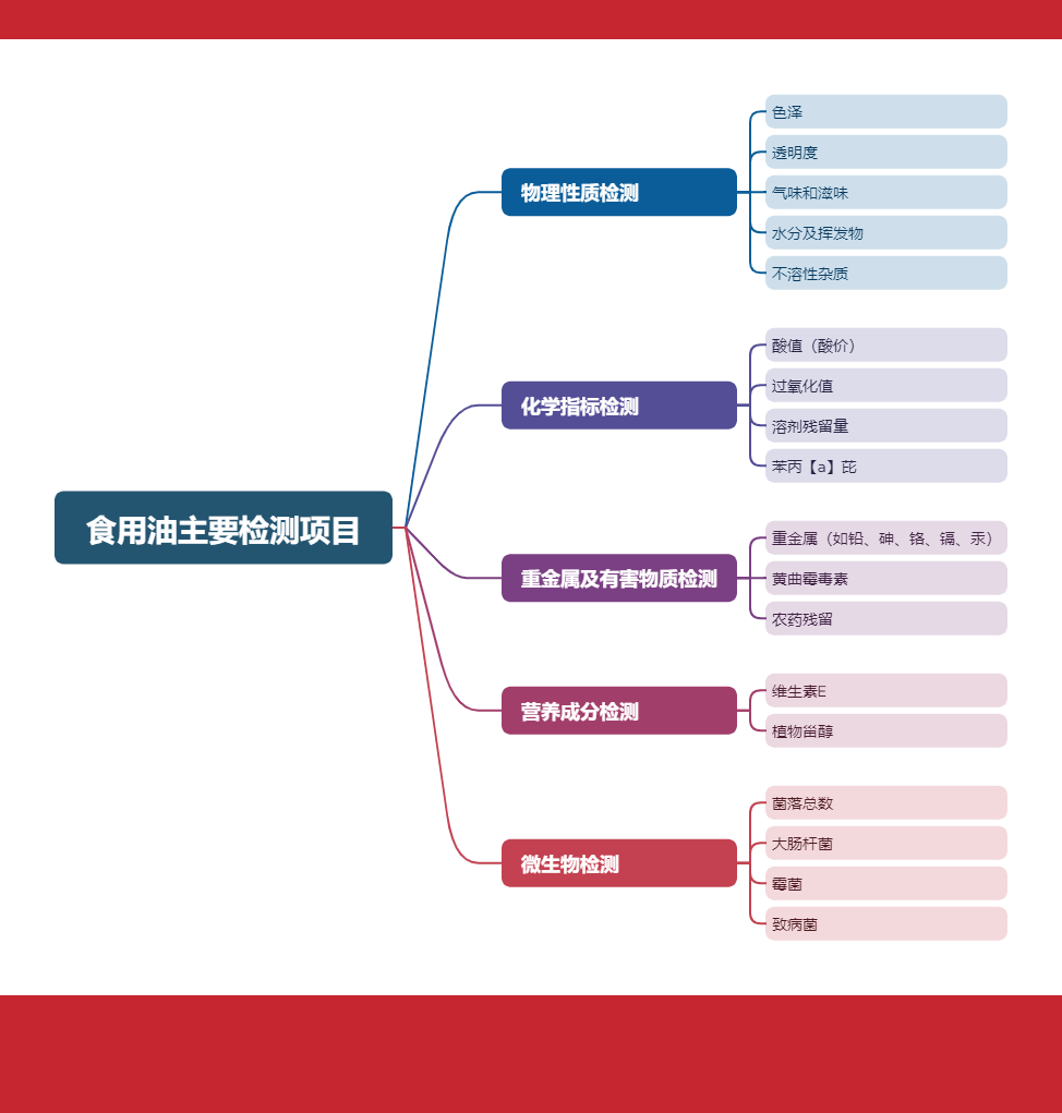 食用油作為日常烹飪的必需品,是餐桌上不可或缺的一部分,其檢測項目眾多,詳細(xì)檢測內(nèi)容請參見下圖。
