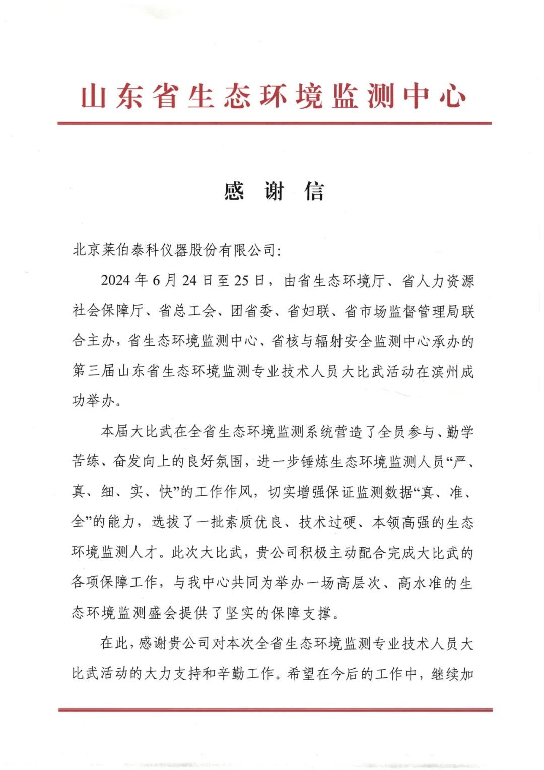 在本次活動中,萊伯泰科大力支持,憑借杰出的貢獻(xiàn)贏得了山東省環(huán)境監(jiān)測中心的高度認(rèn)可與誠摯感謝,共同見證了活動的圓滿成功!