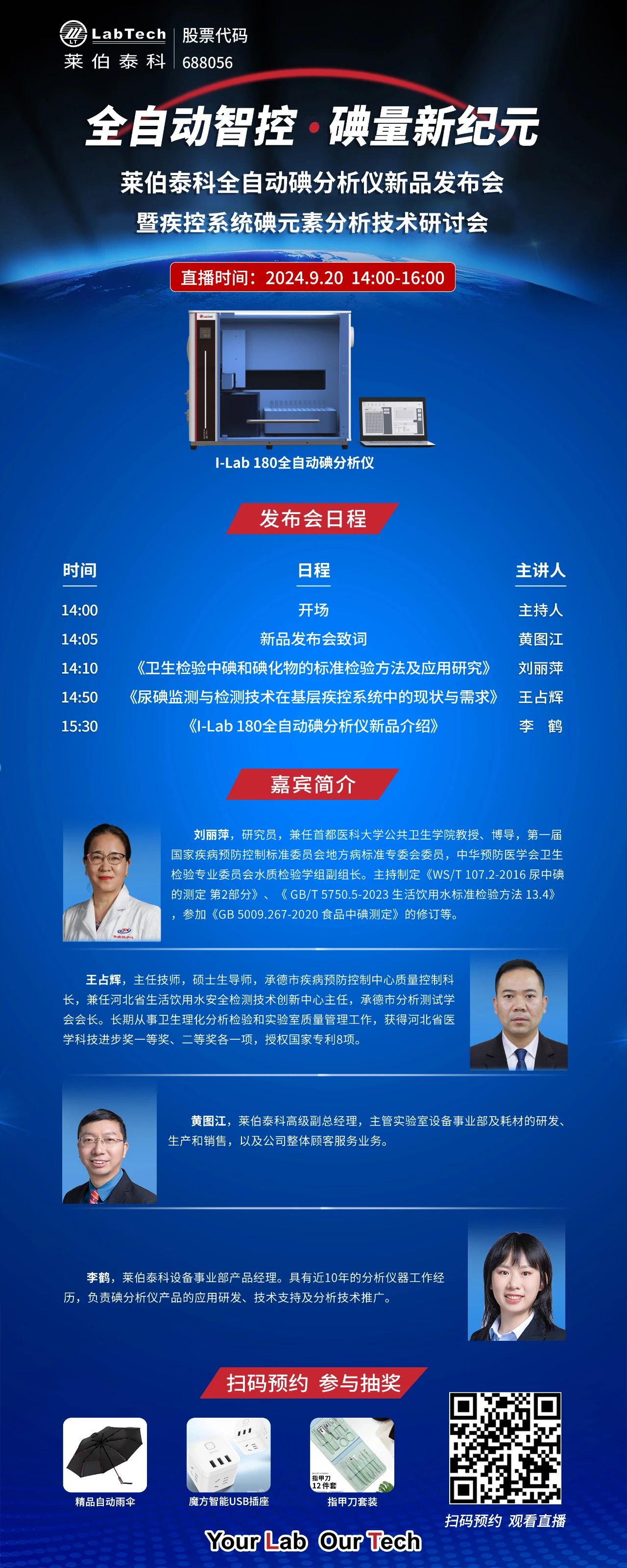 我們誠邀各界人士屆時通過網(wǎng)絡直播平臺觀看這場線上發(fā)布會,共同見證萊伯泰科全自動碘分析儀新品I-Lab 180的誕生,開啟碘量監(jiān)測的新紀元!