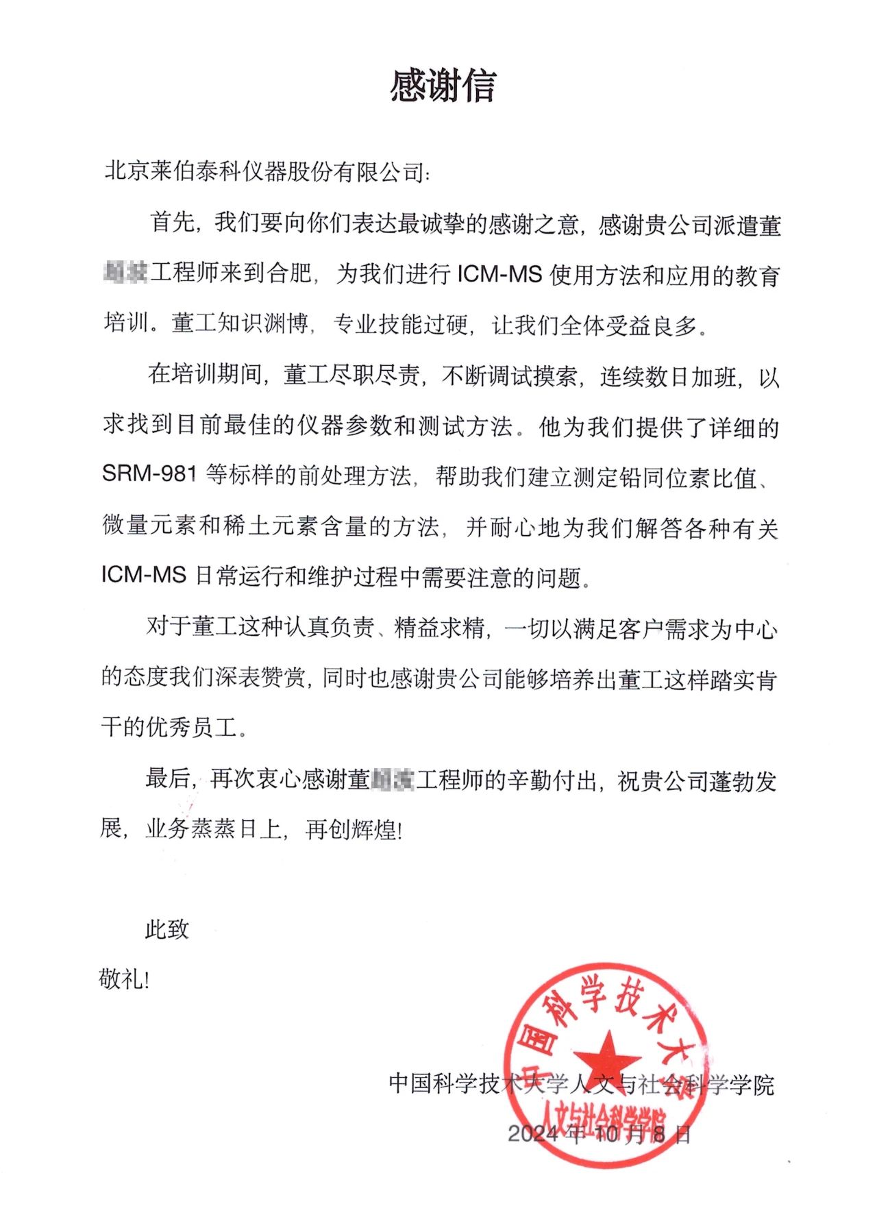 產(chǎn)品優(yōu)異,服務(wù)貼心,口碑自然來!近日,萊伯泰科憑借其細致入微且高度專業(yè)的售后服務(wù),再次贏得了客戶的廣泛贊譽。公司相繼收到了中國科學(xué)技術(shù)大學(xué)人文學(xué)院及揚州市高郵環(huán)境監(jiān)測站專門針對ICP-MS工程師的感謝信,這不僅是對工程師們專業(yè)度的由衷認可,更是對萊伯泰科“以客戶為中心”服務(wù)理念的高度贊揚與肯定。