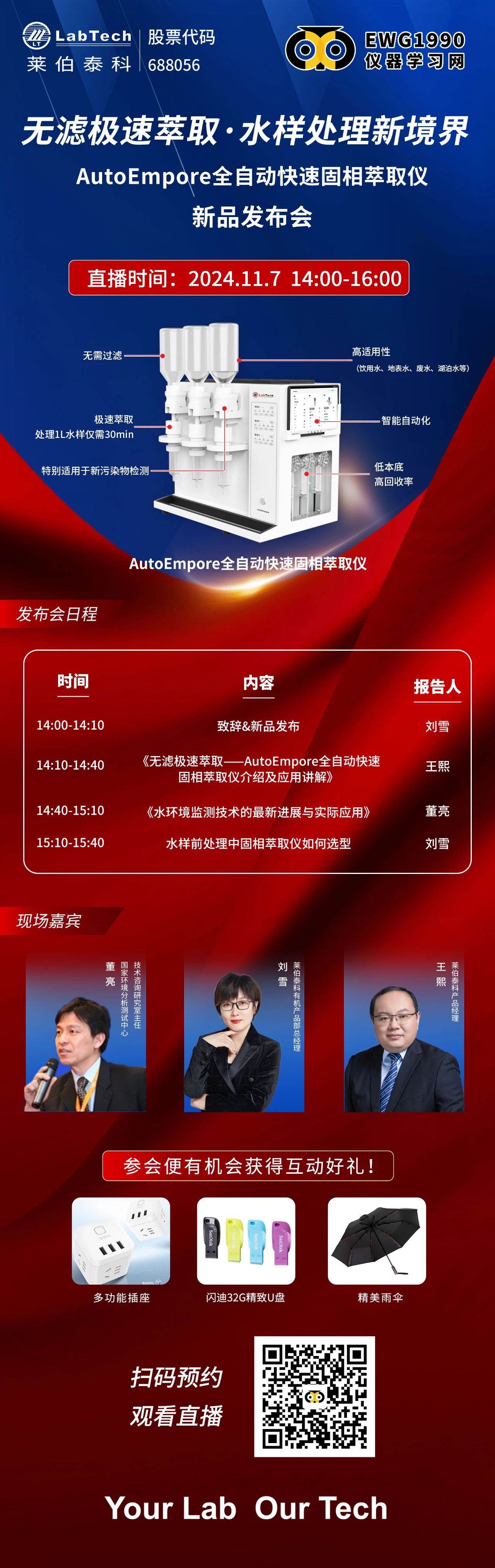 萊伯泰科將于11月7日盛大舉辦“無濾極速萃取 · 水樣處理新境界——AutoEmpore全自動(dòng)快速固相萃取儀新品發(fā)布會(huì)”。此次發(fā)布會(huì)不僅標(biāo)志著萊伯泰科在水樣前處理技術(shù)領(lǐng)域的又一重大突破,更將為環(huán)境監(jiān)測(cè)、水資源管理以及科研領(lǐng)域帶來更加高效的解決方案。