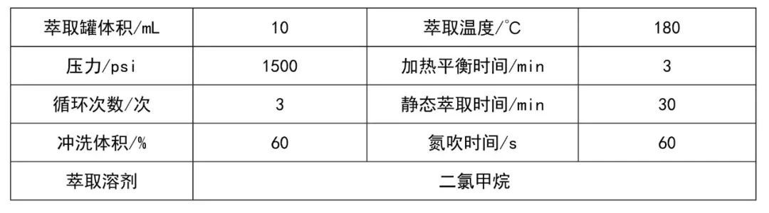 用天平分別稱取2mg各微塑料,利用高溫高壓萃取方式進行溶解,高壓萃取罐10mL , 萃取溫度180℃ ,高壓1500psi ,每次萃取時間30min ,萃取3次,萃取溶劑為二氯甲烷,最終溶劑定容40mL。
