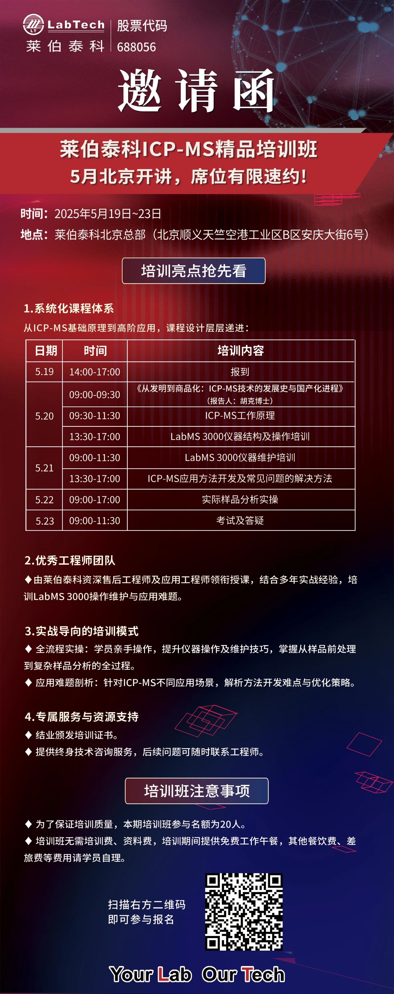 萊伯泰科誠(chéng)摯邀請(qǐng)您參加“ICP-MS全流程技術(shù)實(shí)戰(zhàn)培訓(xùn)班”!培訓(xùn)班將于2025年5月19日至23日在萊伯泰科北京總部舉辦。