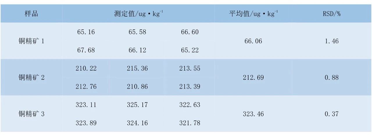 選取3個(gè)含不同濃度汞的銅精礦樣品,進(jìn)行6次平行測(cè)定,精密度試驗(yàn)結(jié)果見表3。